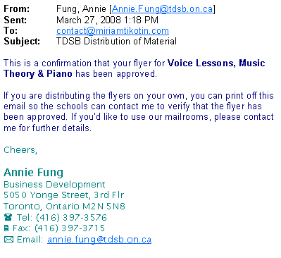 The Toronto District School Board (TDSB) approved Miriam Tikotin’s Voice Studio, as you can read in the following e-mail (click here to print the e-mail).